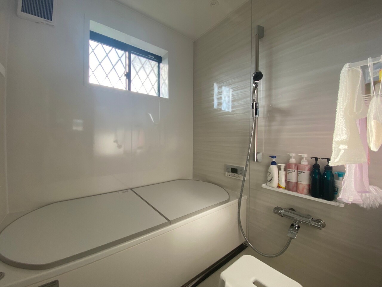 広々した浴槽に、白とベージュの壁と床でシンプルですっきりとした雰囲気の空間に仕上がりました!