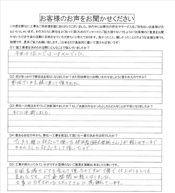 お風呂場のドアを変えて頂いたのですが、丁寧で仕上がりもとても良かったです。