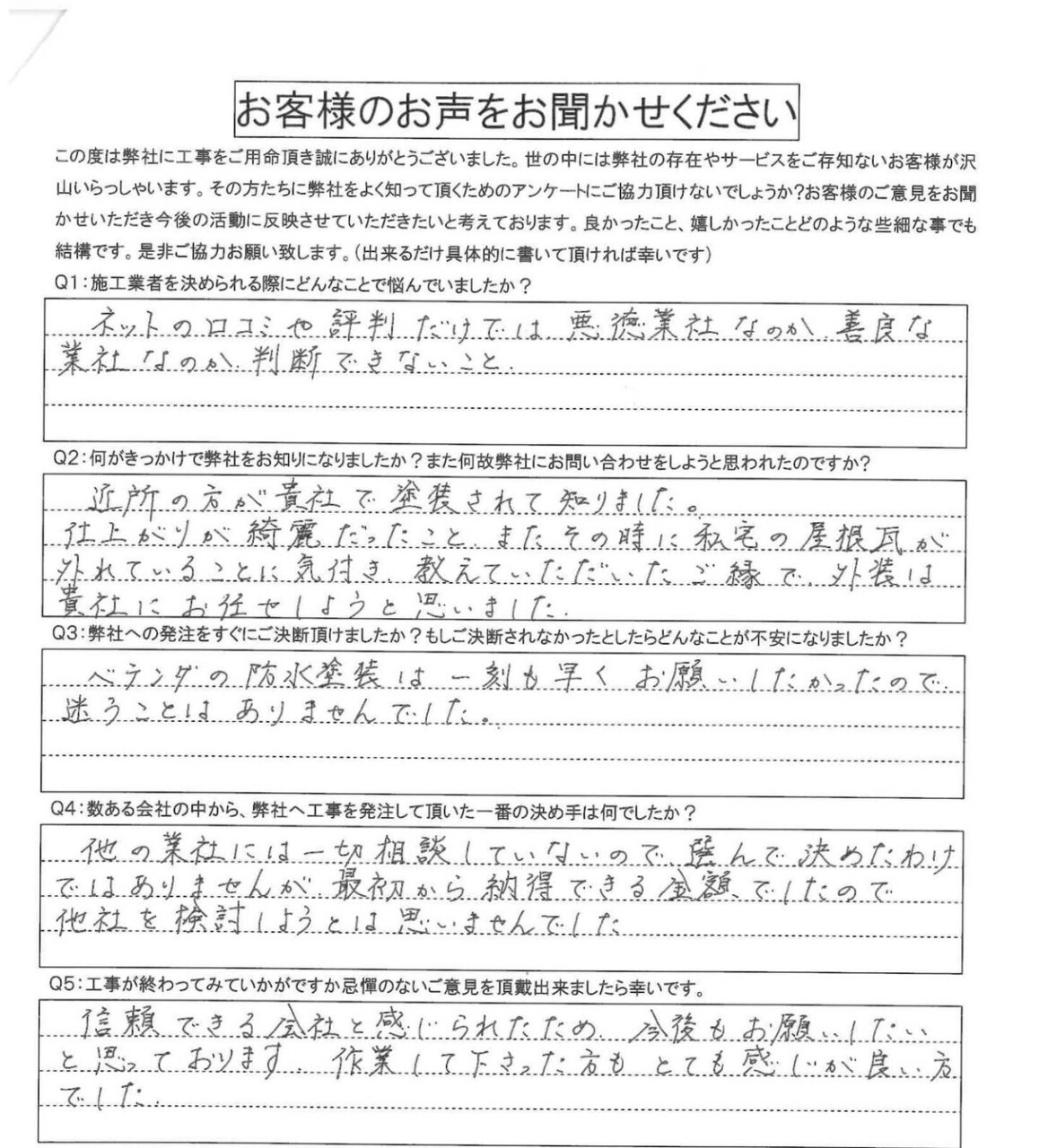 仕上がりが綺麗だったこと、またその時に私宅の屋根瓦が外れていることに気付き、教えていただいたご縁で、外装は貴社にお任せようと思いました。 - 弊社への発注をすぐにご決断頂けましたか?もしご決断されなかったとしたらどんなことが不安になりましたか?