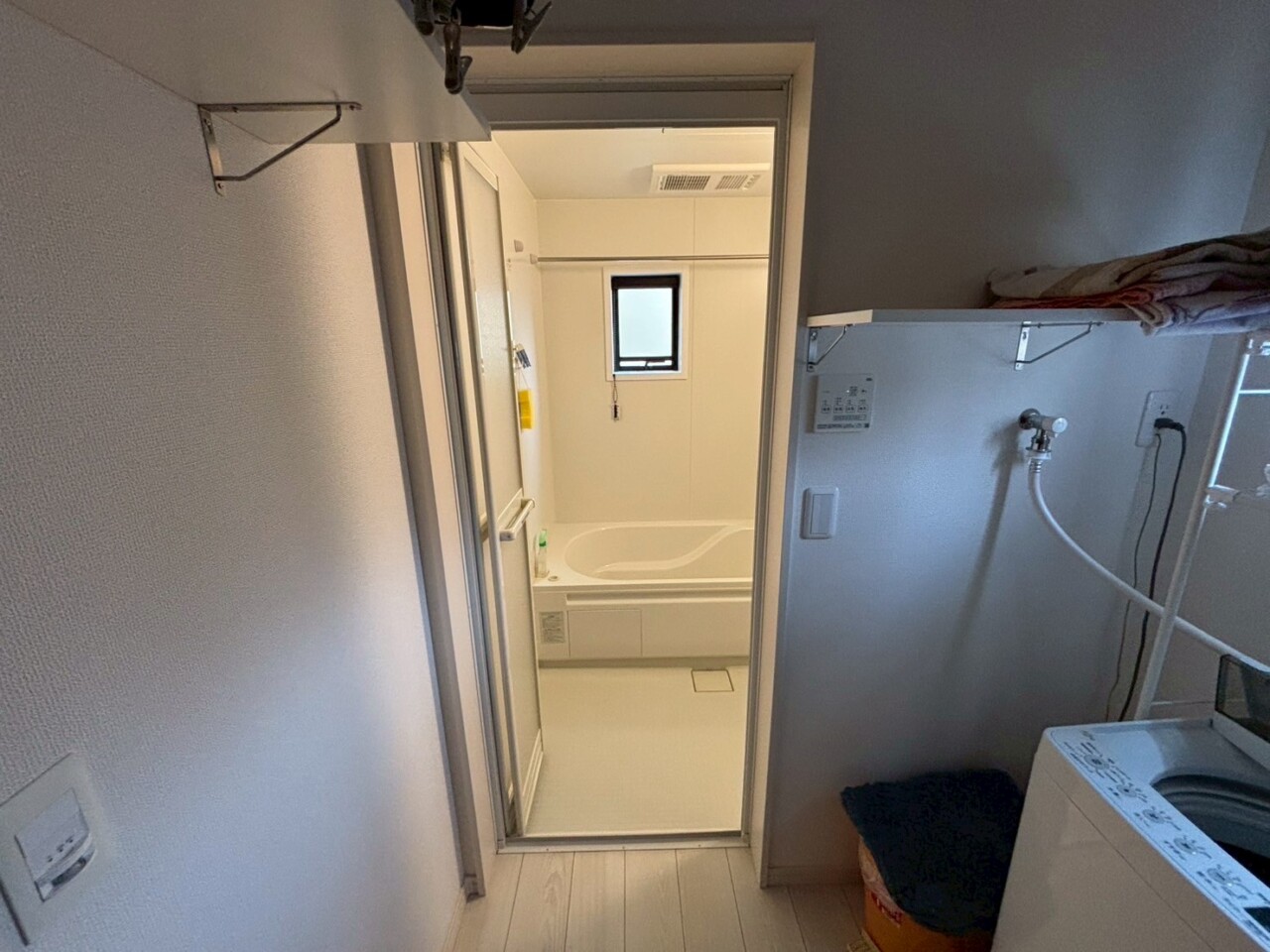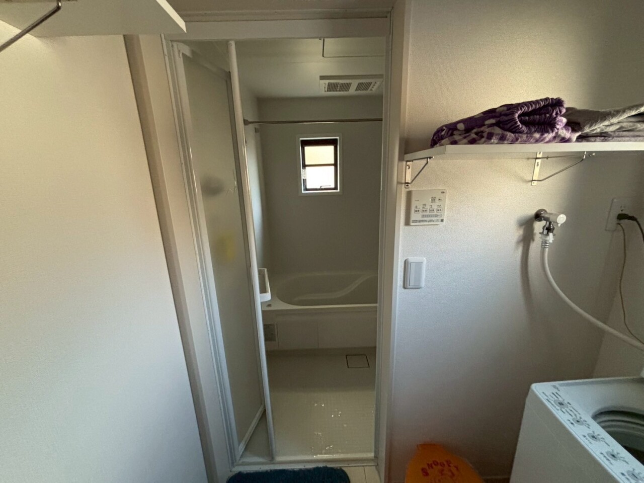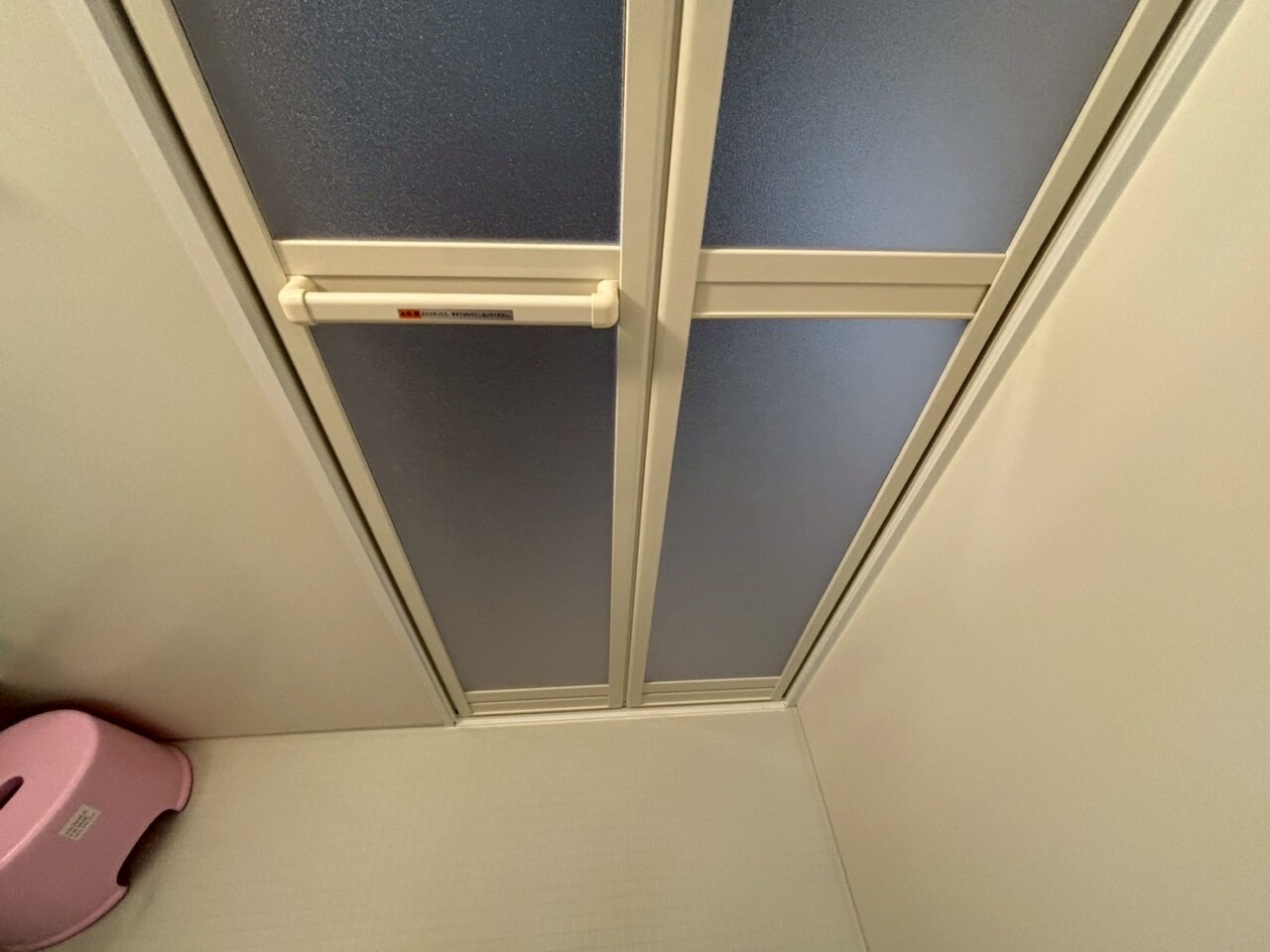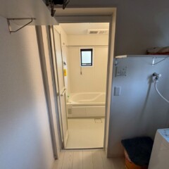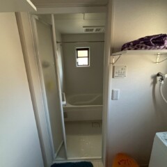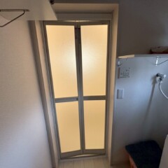 まず、既存の折れ戸を取り外し、新しい浴室用ドアへ交換しました。最近の浴室ドアは、軽くて開け閉めがしやすく、力を入れなくてもスムーズに動く設計になっています。そのため、小さなお子様やご高齢の方でも安心してご使用いただけます。