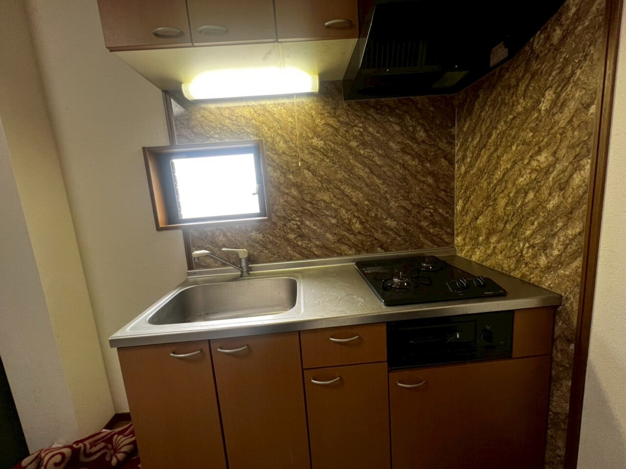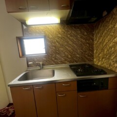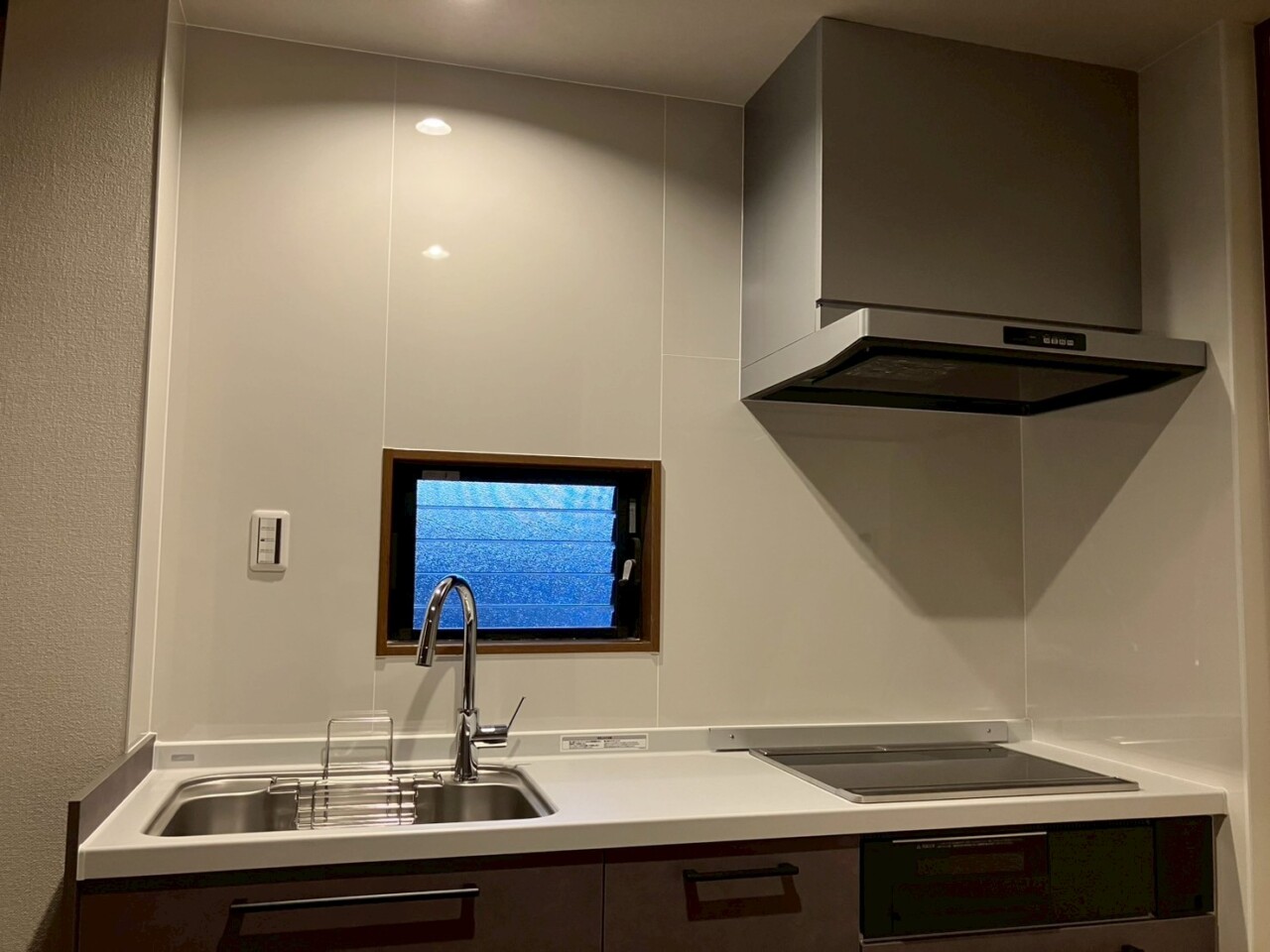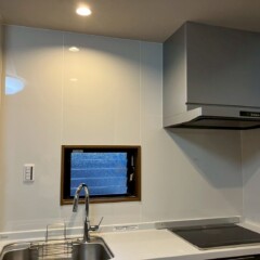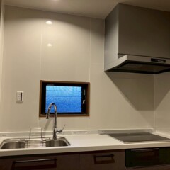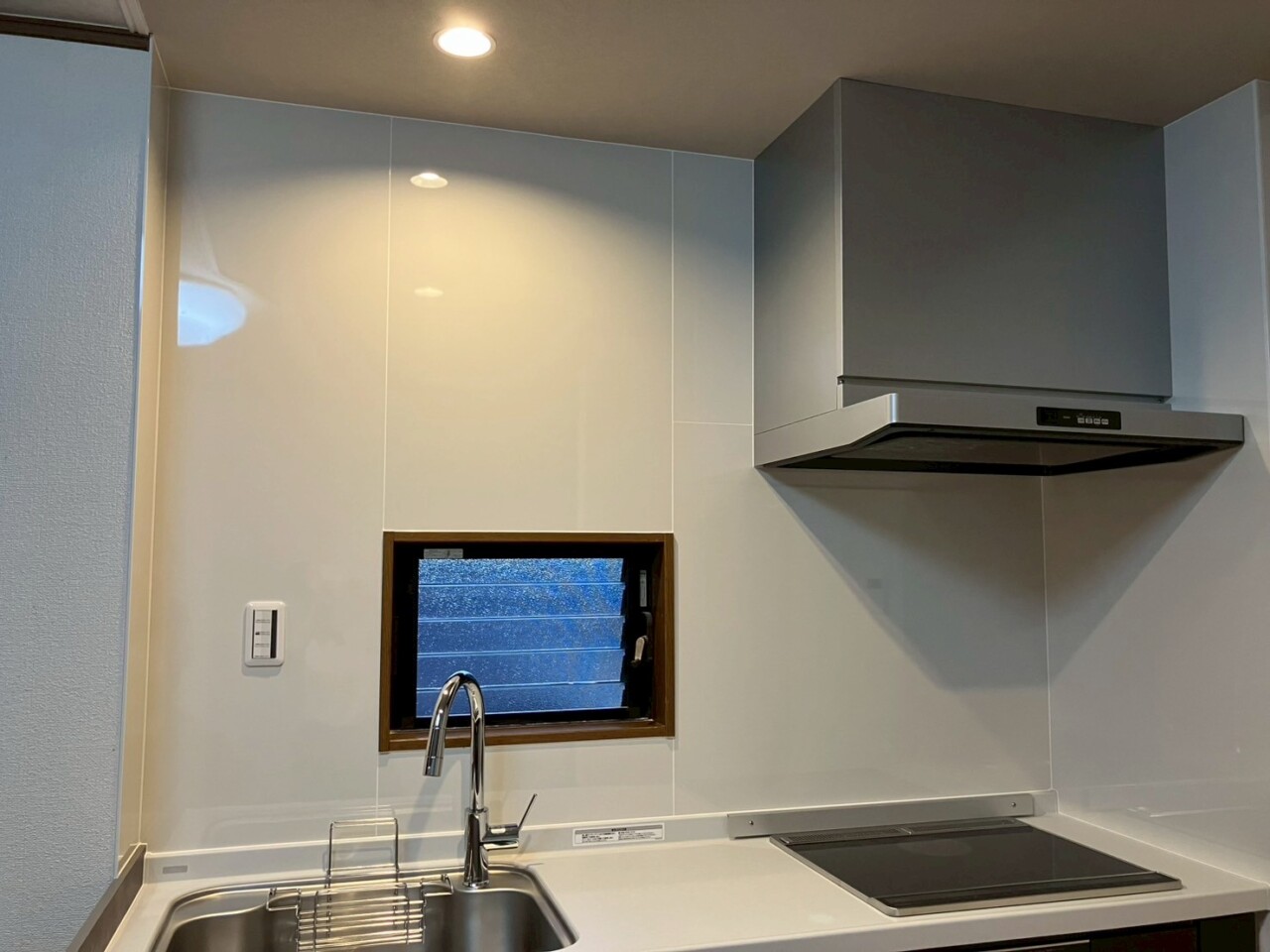 壁面にはホワイト系のキッチンパネルを採用し、照明にはLEDダウンライトを設置しました。これにより、以前の暗い印象が一新され、明るく開放的な空間に生まれ変わりました。