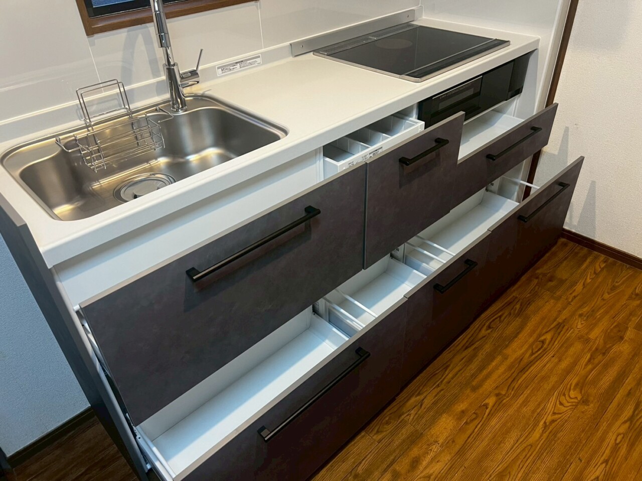 収納力の高さ抜群!使いやすさを考えた引き出し式の収納で、調理器具や調味料もスッキリ整理。