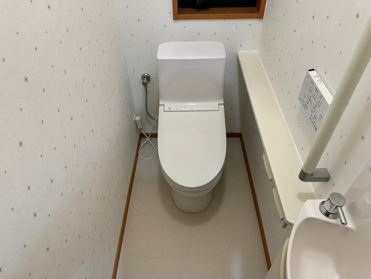 今回のリフォームでは、トイレ本体の交換に合わせて**壁紙(クロス)と床(クッションフロア)**も張替えを行いました。